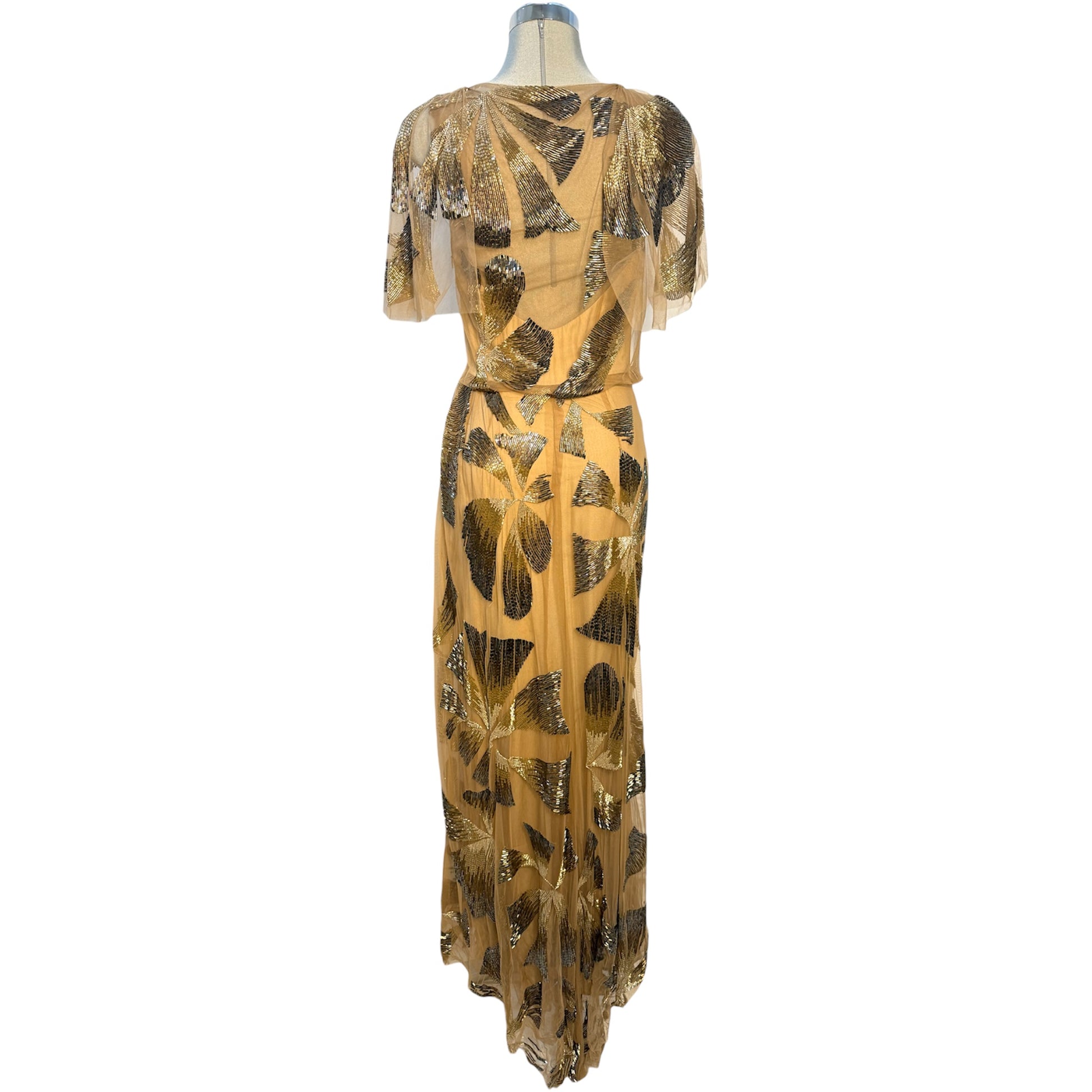 Beautiful floral patterned gold & copper beaded sheer maxi dress from the Monique L'Huillier Collection. 100% Silk Lining. Dry Clean Only.